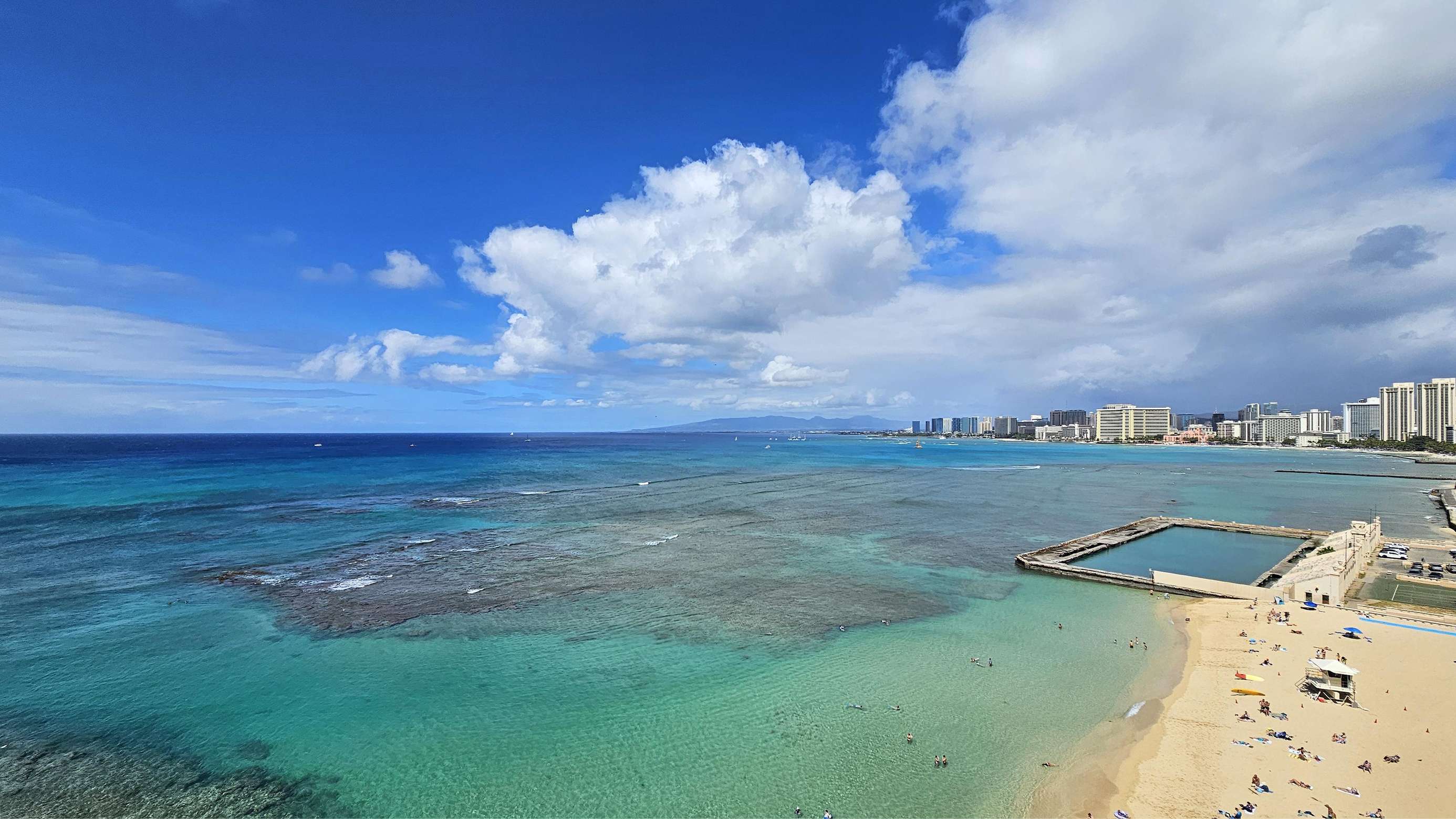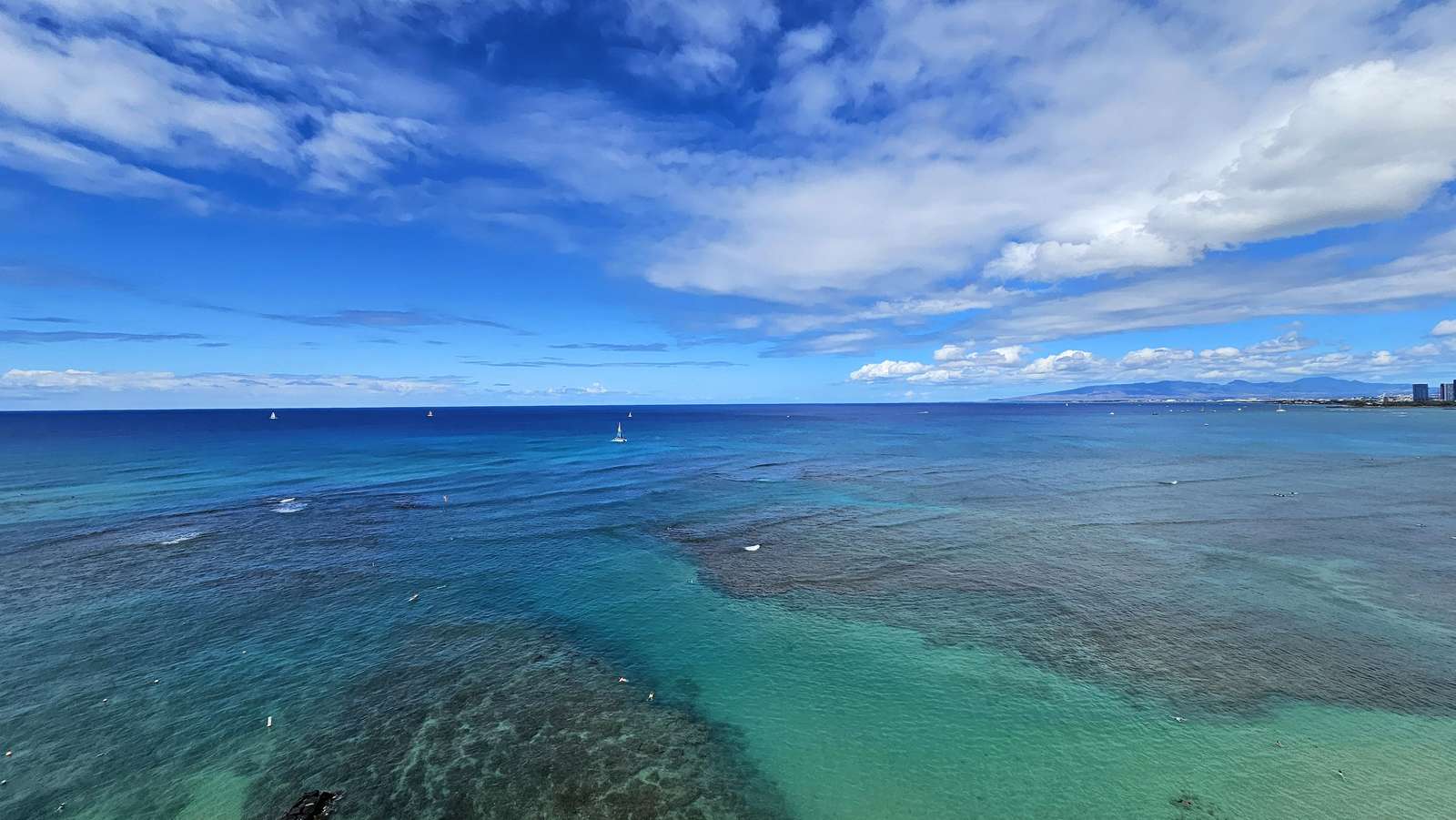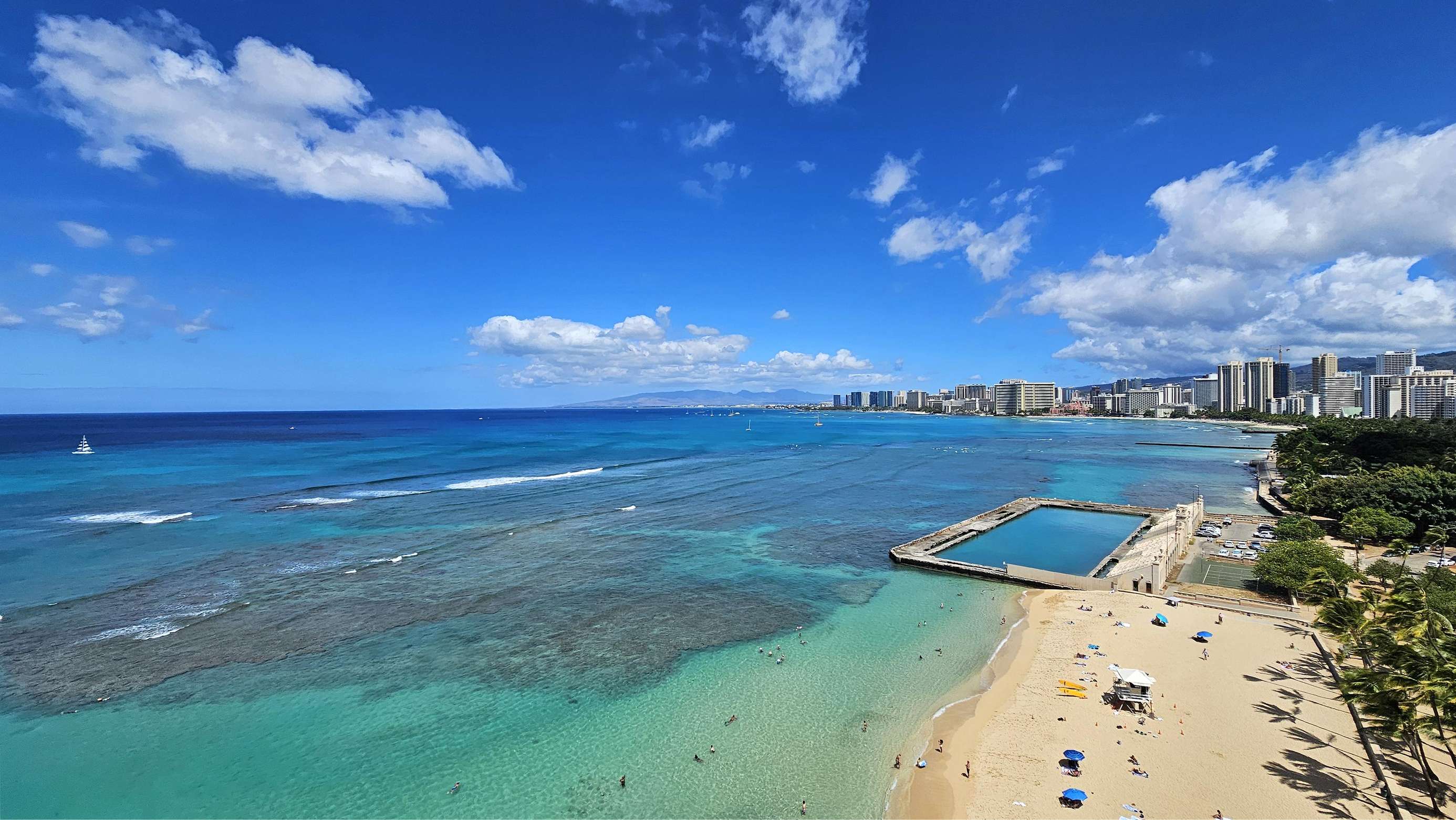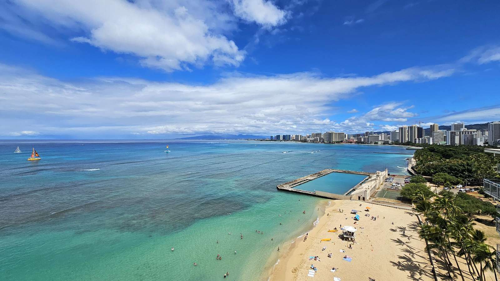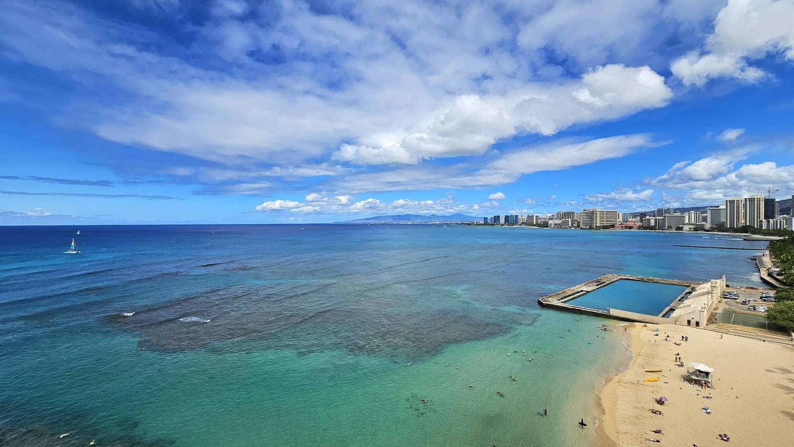 Bright and Breezy 12th floor Sans Souci Queen Bedroom Condo with covered private lanai overlooking Kaimana beach, Honolulu Bay & aqua marine Pacific Ocean. Smart TVs in both Living & Bedroom.