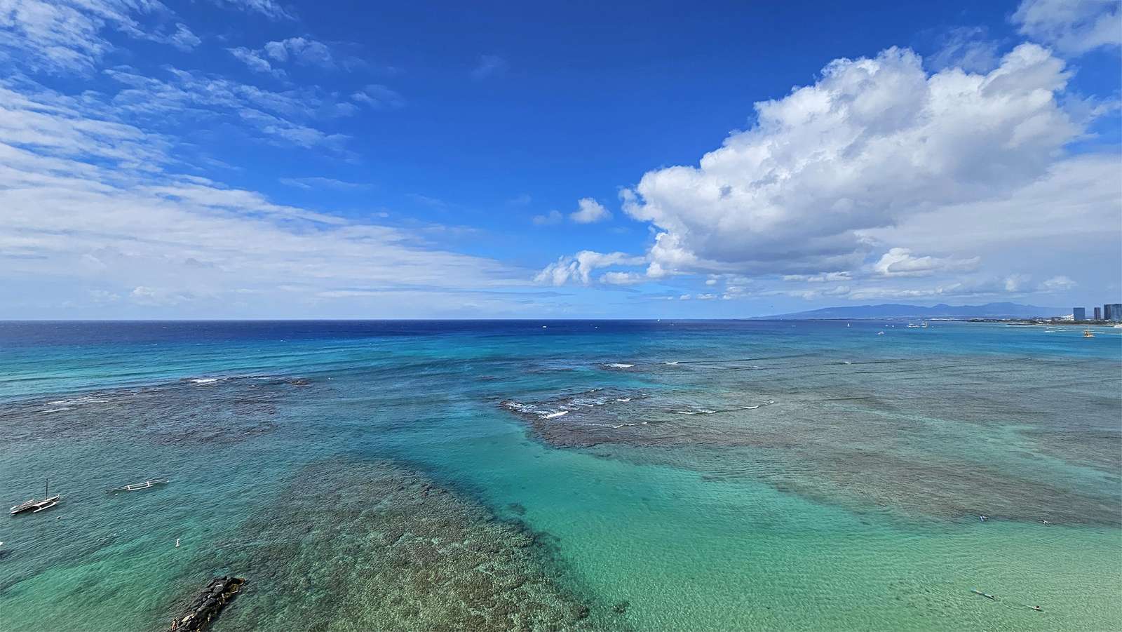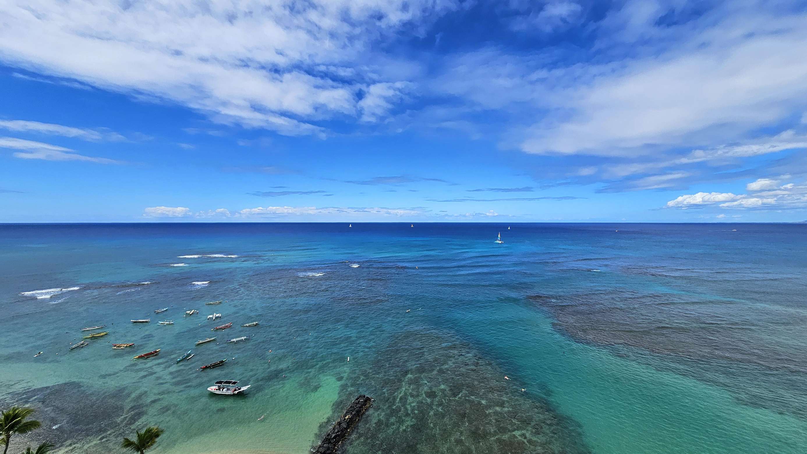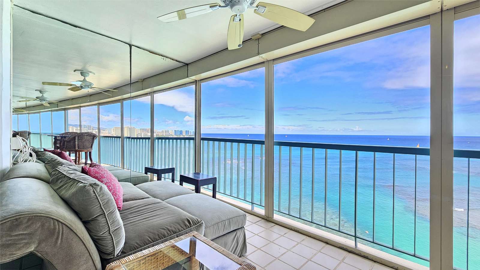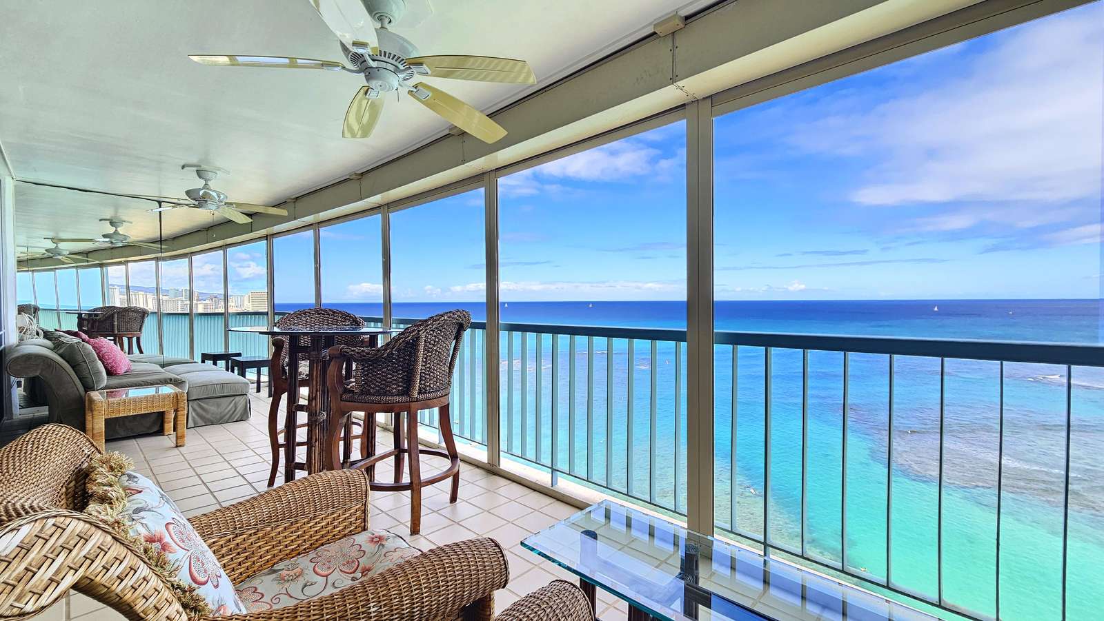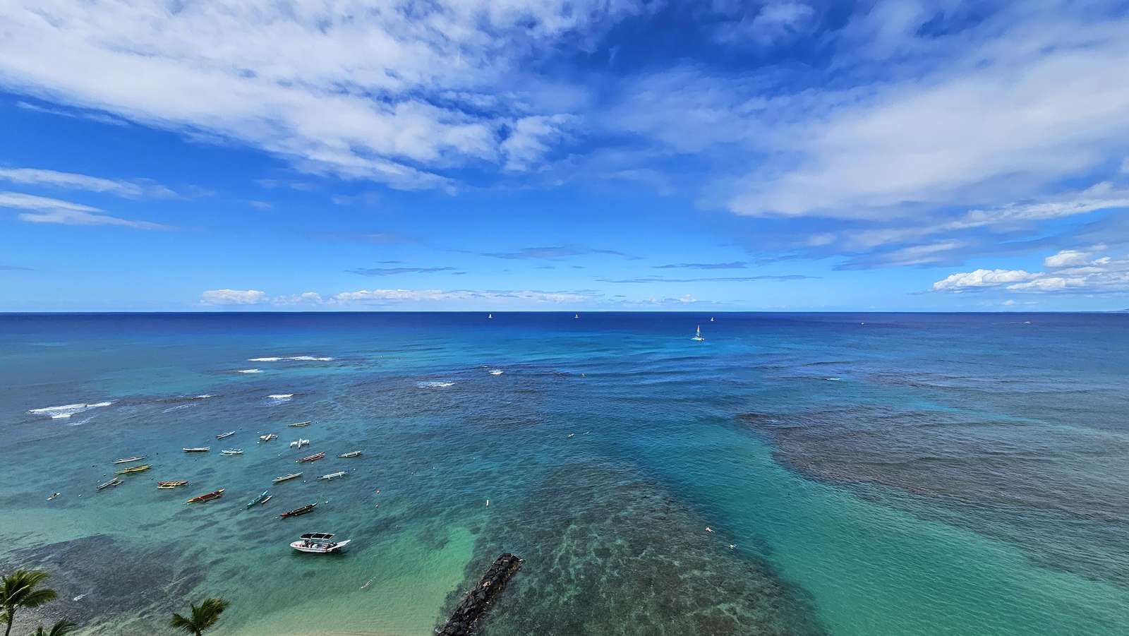 Bright and Breezy 12th floor Sans Souci Queen Bedroom Condo with covered private lanai overlooking Kaimana beach, Honolulu Bay & aqua marine Pacific Ocean. Smart TVs in both Living & Bedroom.