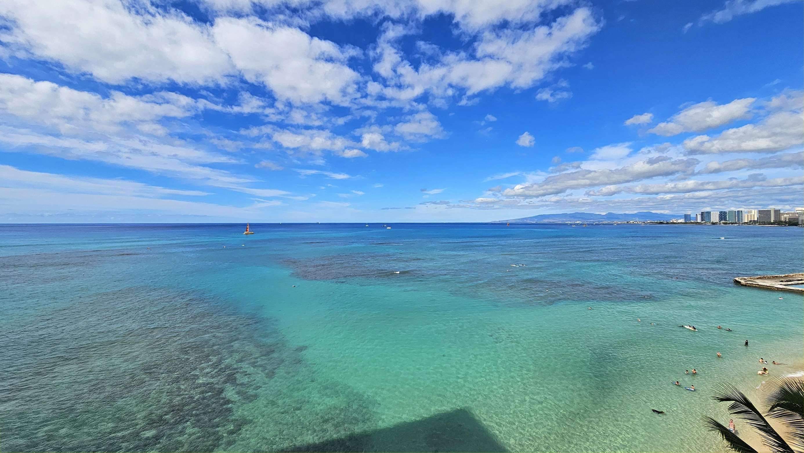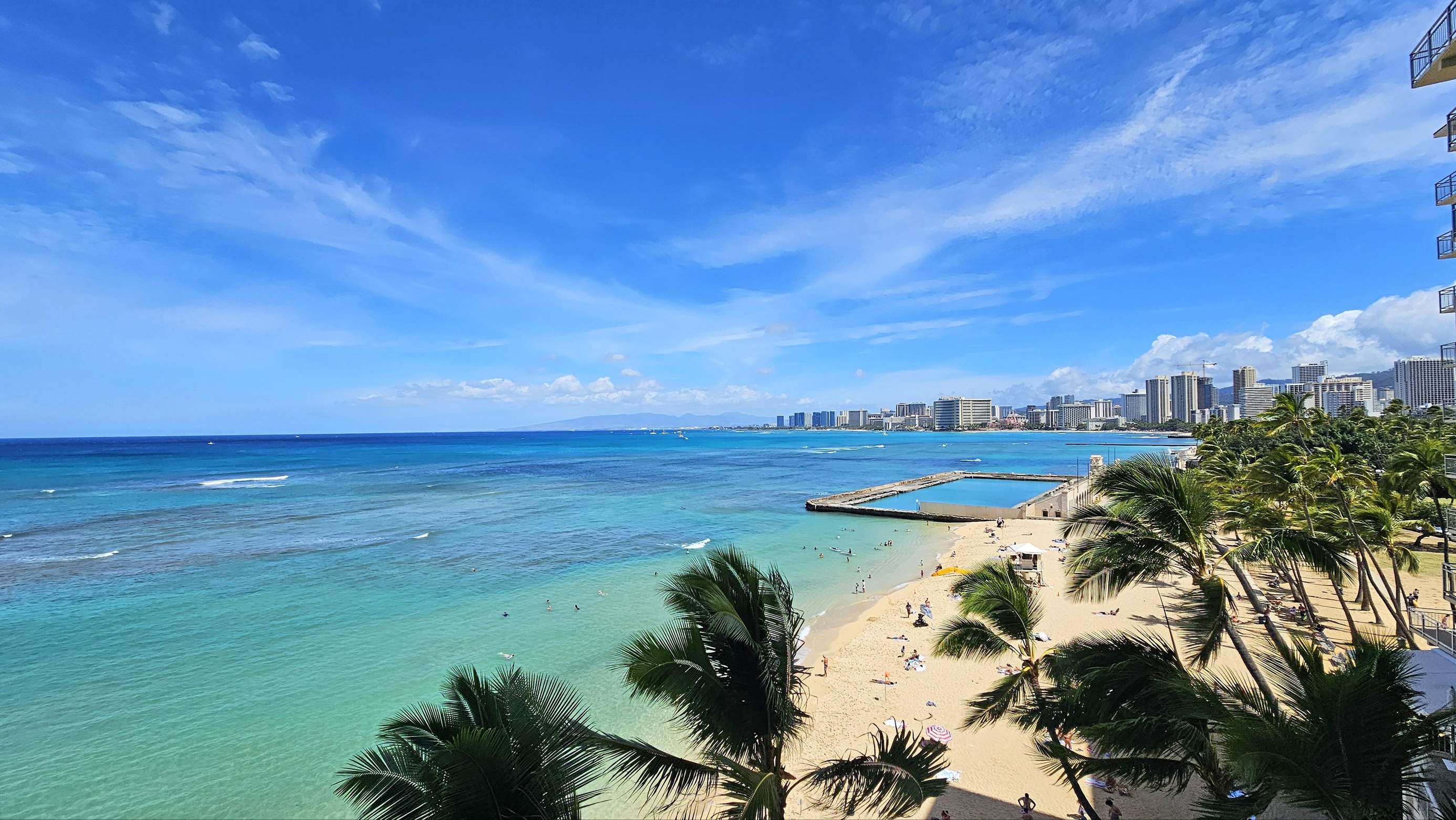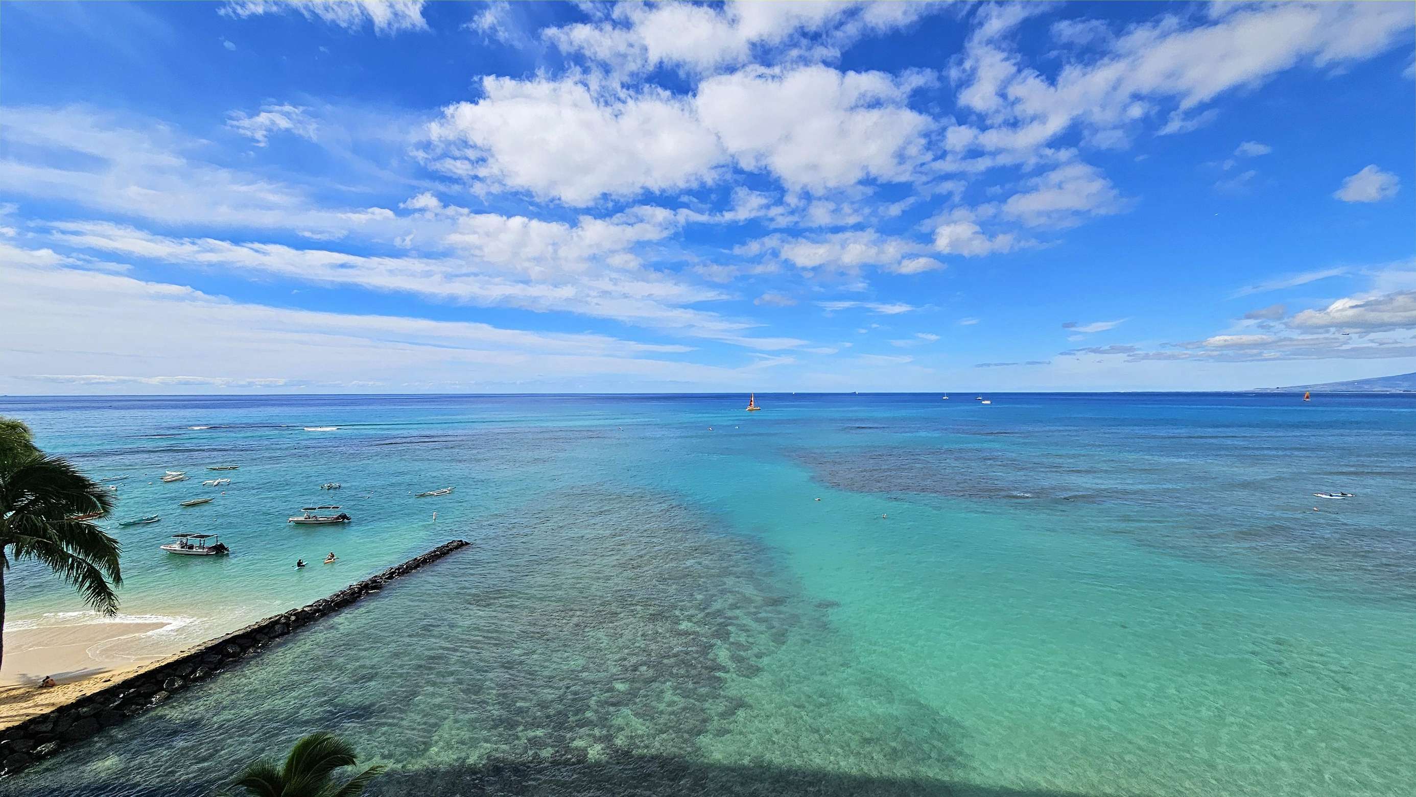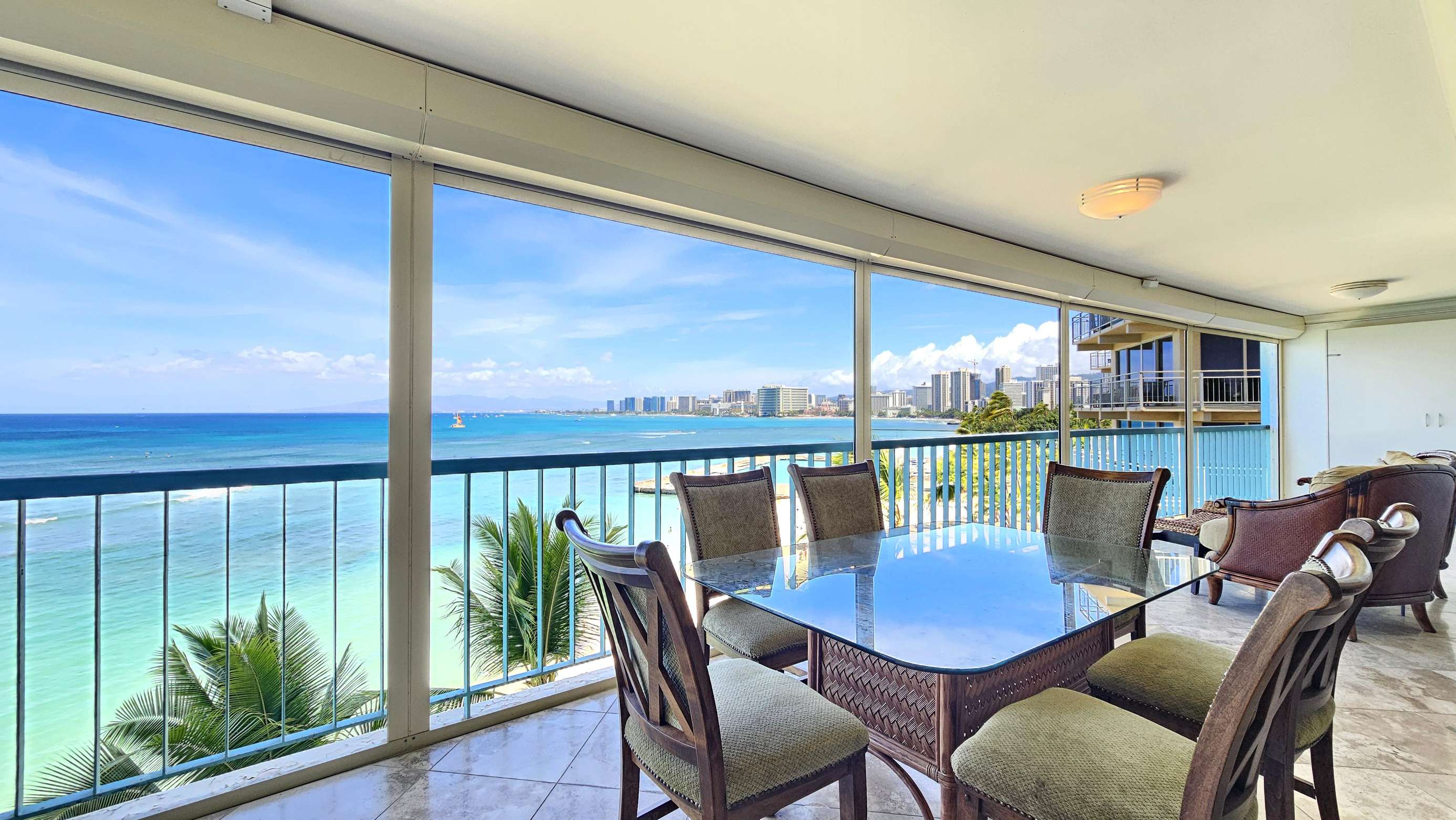 Bright and Breezy 5th floor Sans Souci Two Bedroom Apartment with covered private lanai overlooking Kaimana beach, Honolulu Bay & aqua marine Pacific ocean.
