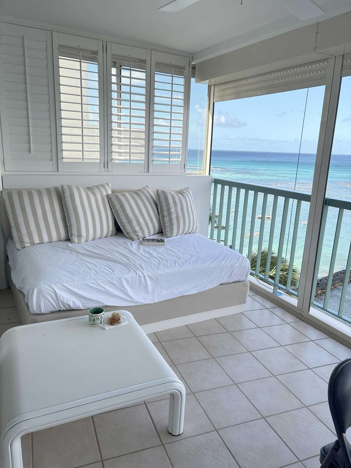 Sunroom with tiled floor, striped cushions on a white daybed, and large windows overlooking the ocean.