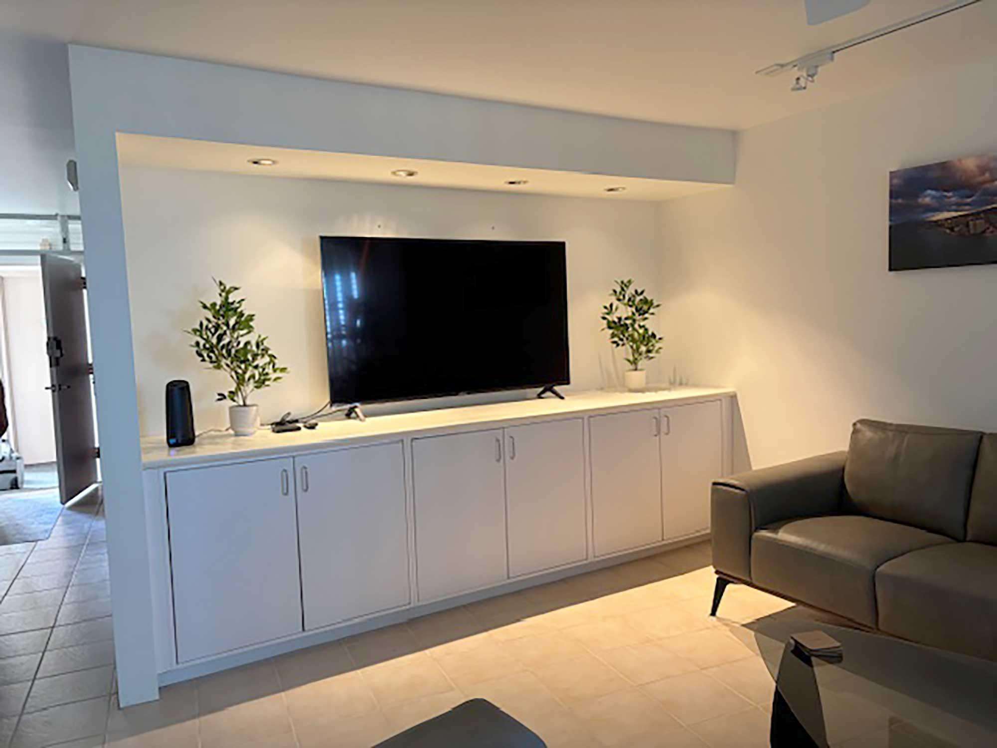 Living room featuring a wall-mounted flat-screen TV above white cabinetry, flanked by potted plants and soft overhead lighting.