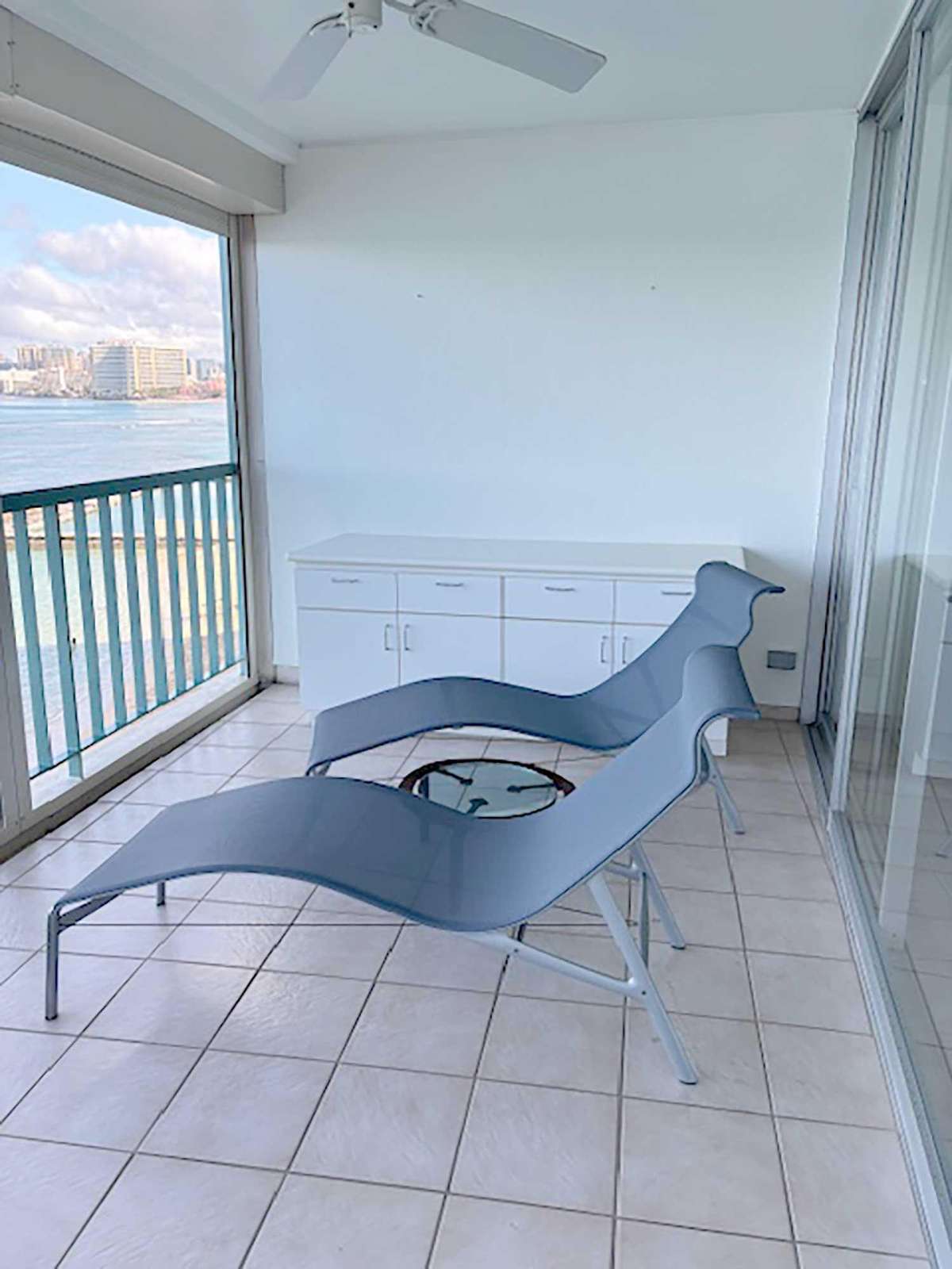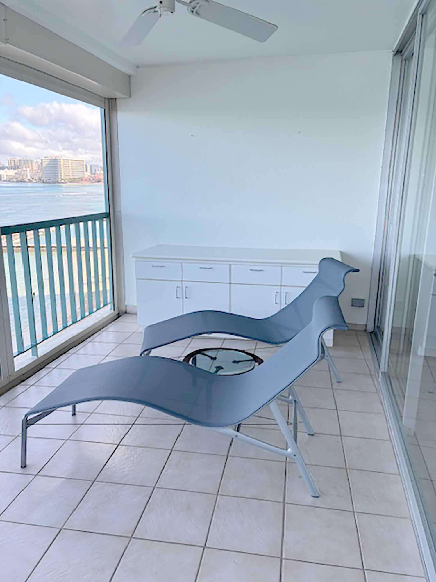 Balcony seating with cushioned white chairs and a sleek rectangular table overlooks the blue ocean and sailboats.