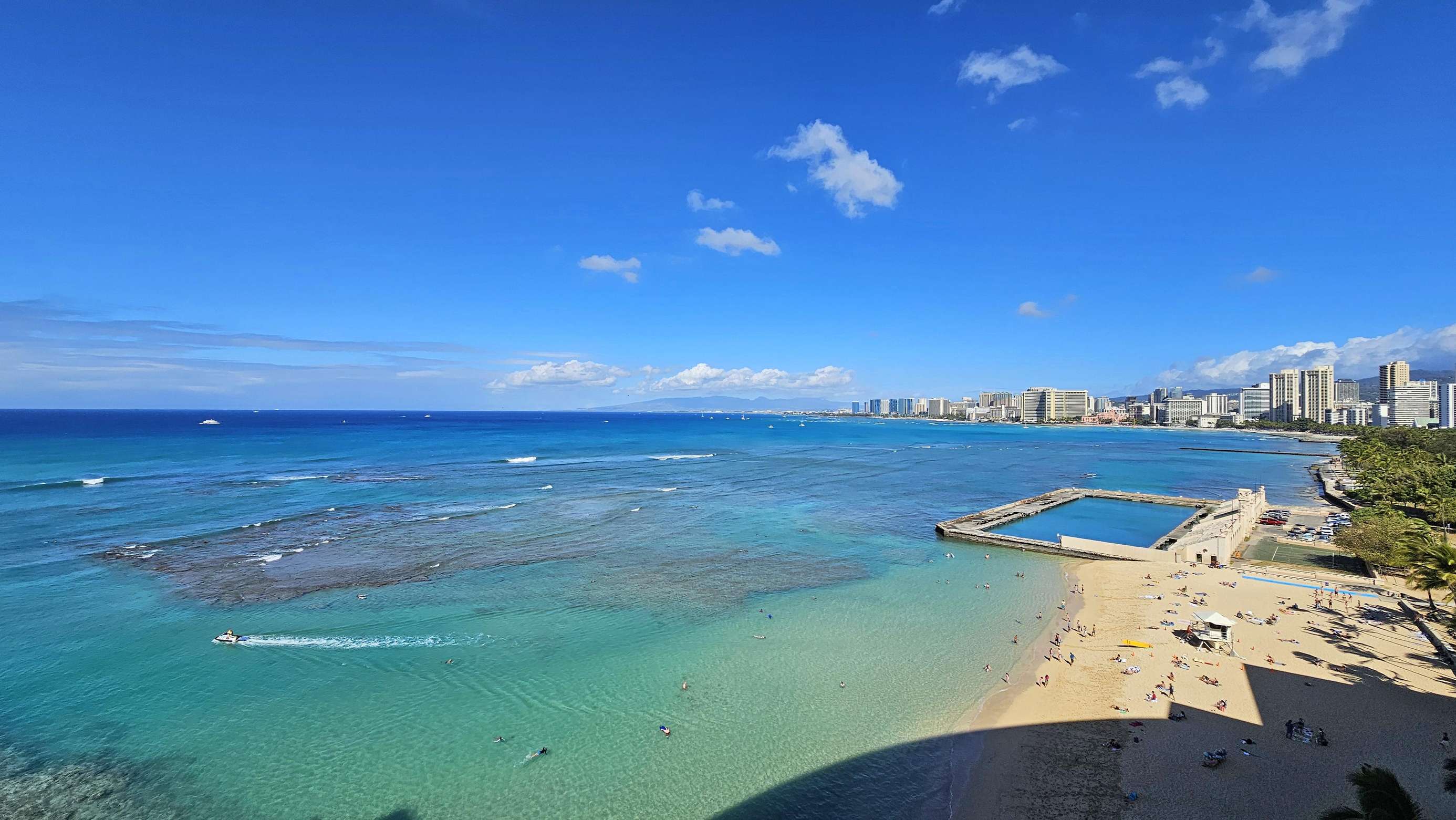 The unusual 40’ long oceanfront lanai offers outdoor living and dining with expansive views of Waikiki and Kaimana Beach below mirrored at each end to give you never ending views in both directions. The beautiful beach is accessible from the first-floor walkout directly to the sands of Kaimana Beach. Among the swaying palm trees, Sans Souci Beach offers a tranquil setting ideal for sunbathing, swimming, and leisurely strolls along the shoreline. Water enthusiasts are lured by the array of activities available, including snorkeling, surfing, and other aquatic adventures. Beach chairs and umbrellas and beach towels are included for your use.