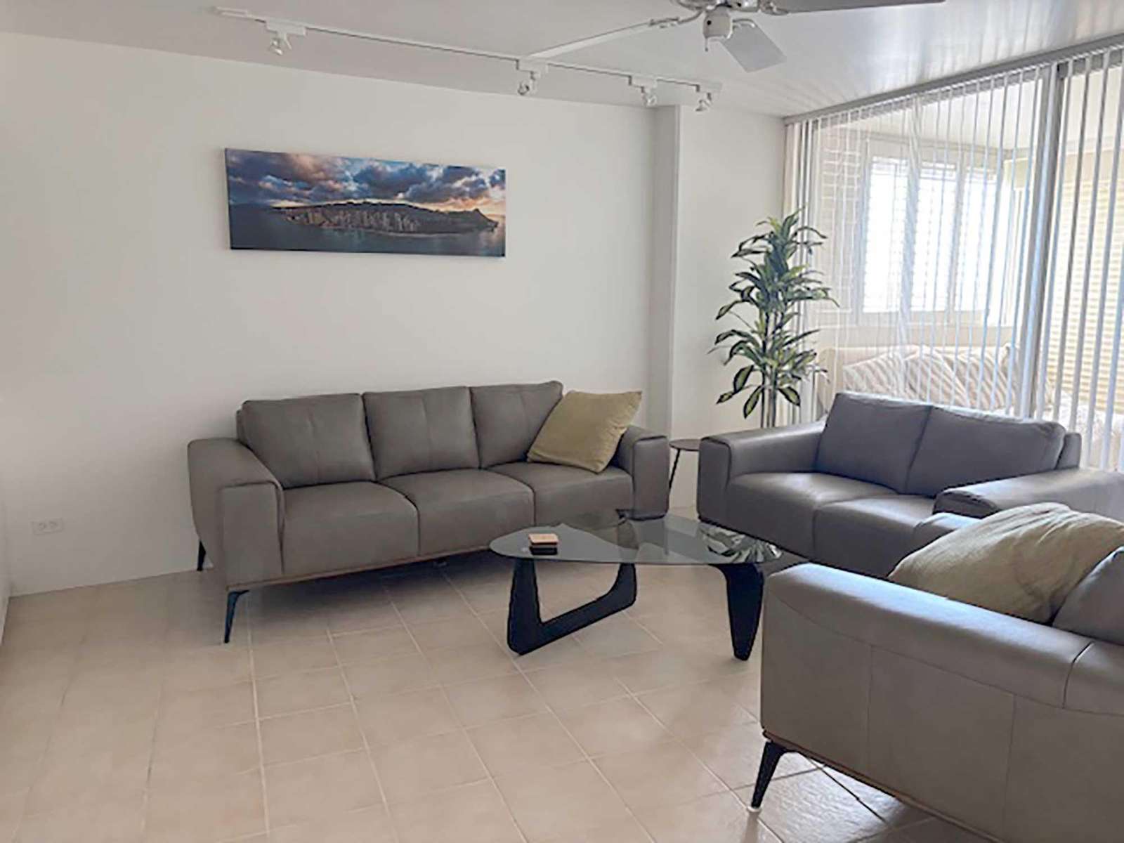Living area with gray leather sofas, triangular glass coffee table, and panoramic island landscape wall art.