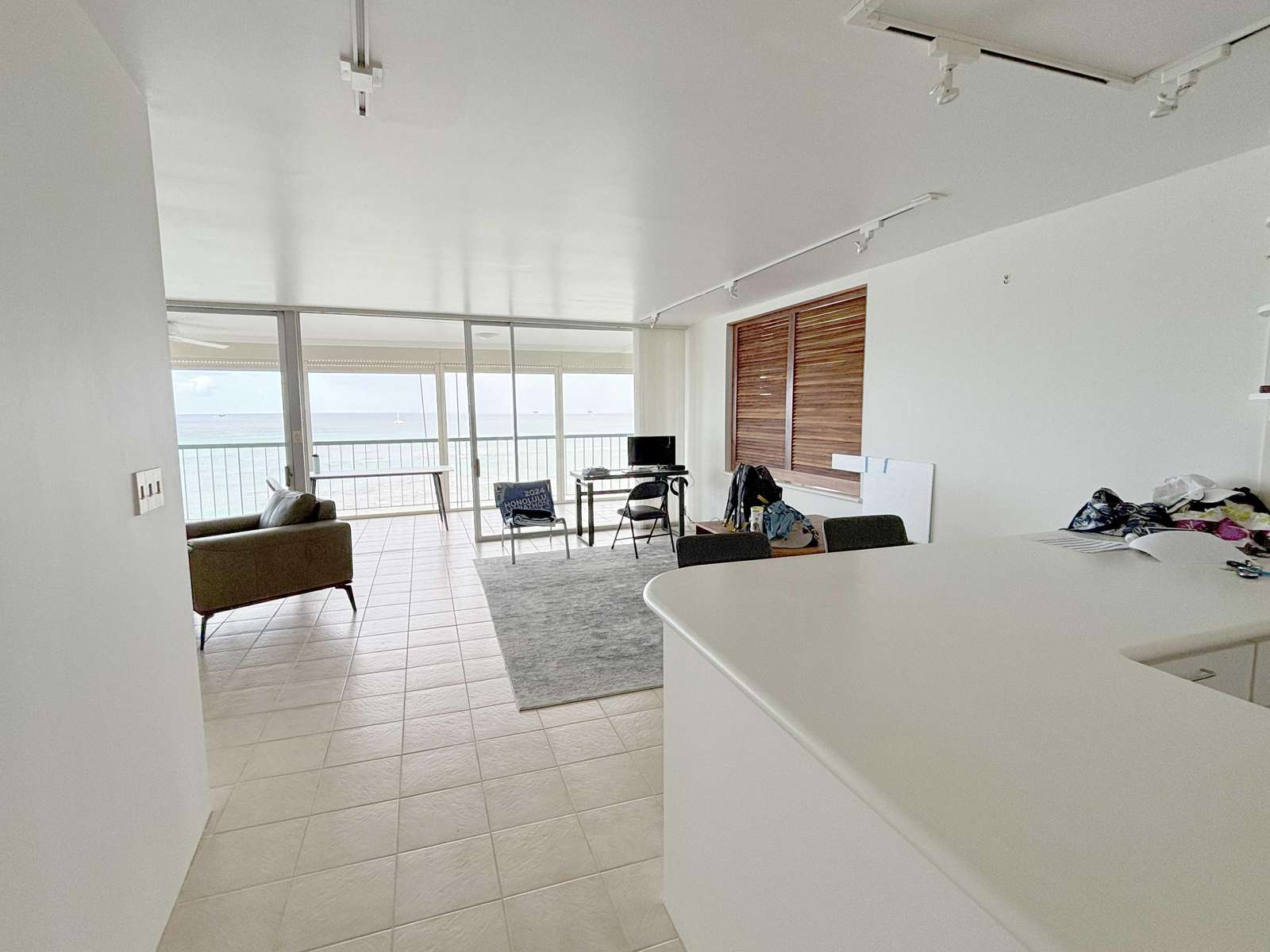 Open living area features tiled floors, a gray area rug, and sliding glass doors opening to the balcony.