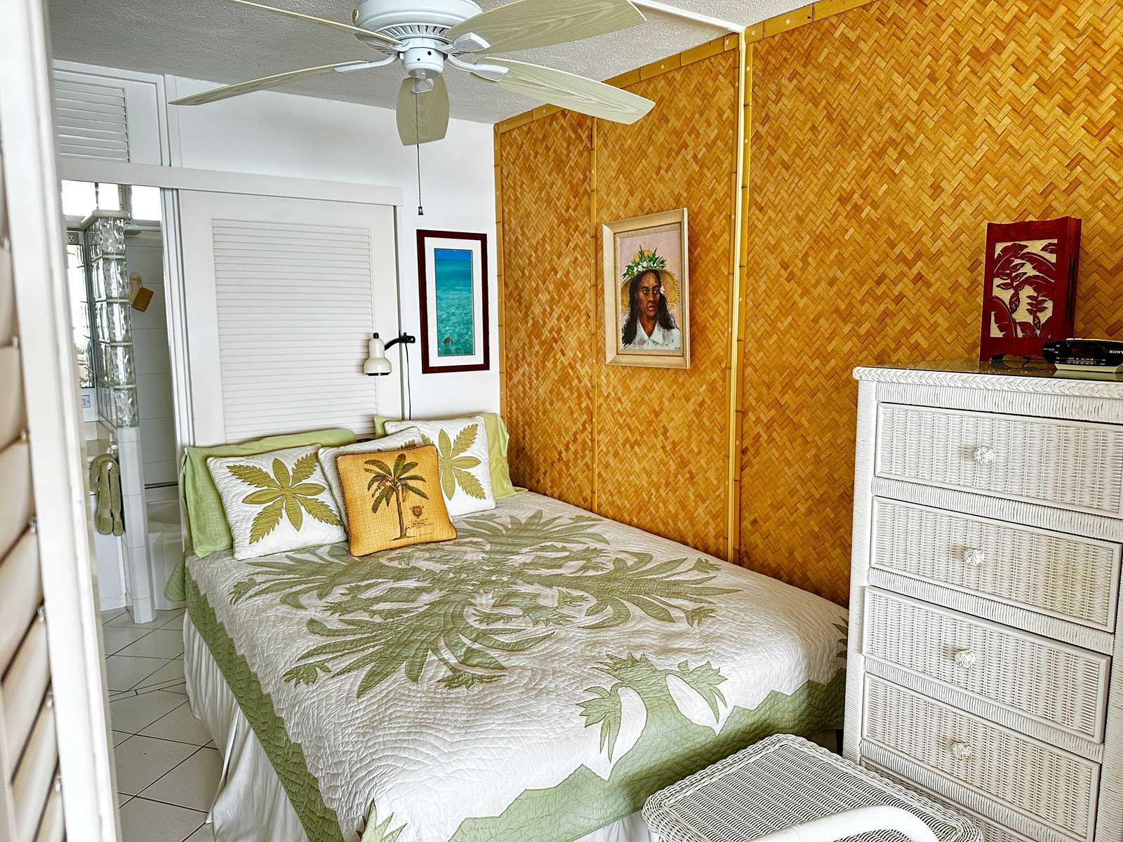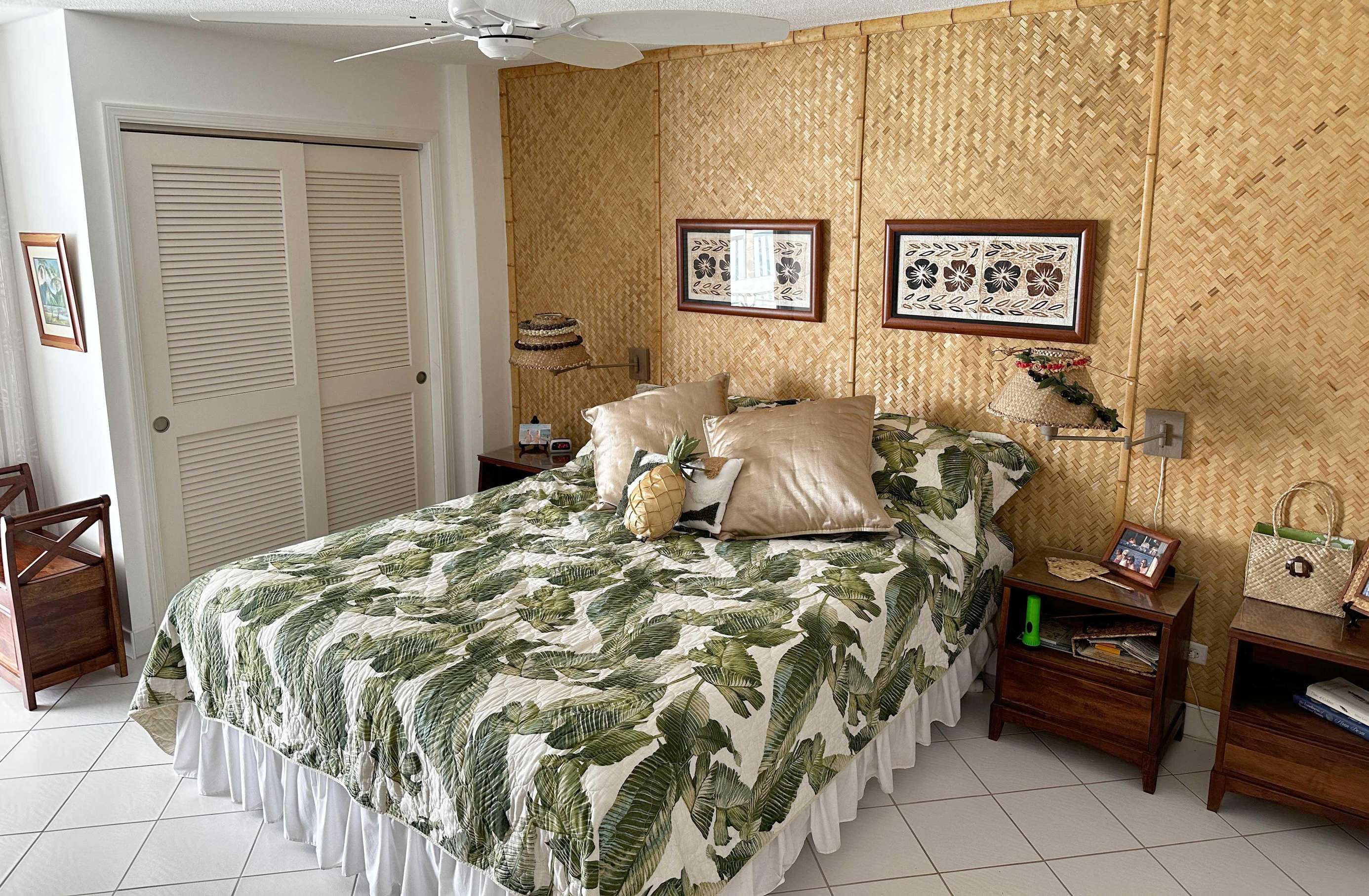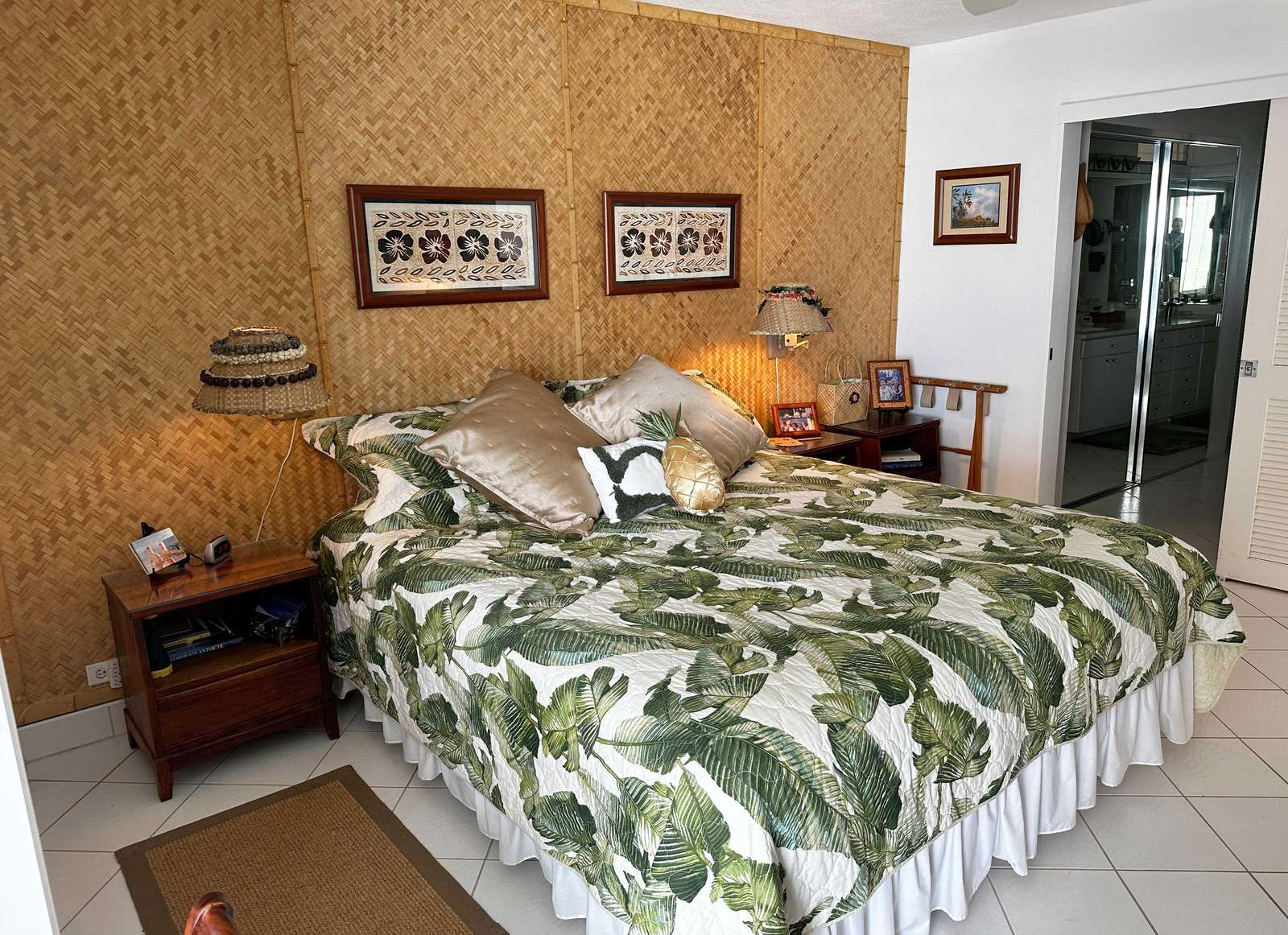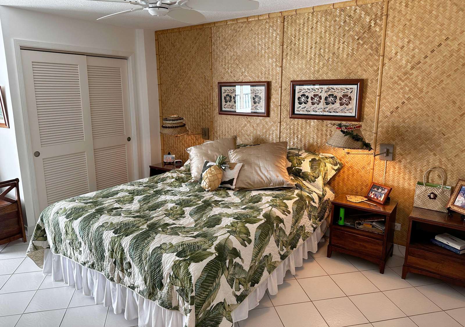 Bedroom with tropical leaf-patterned quilt, bamboo-textured accent wall, bedside tables, and tiled floor.