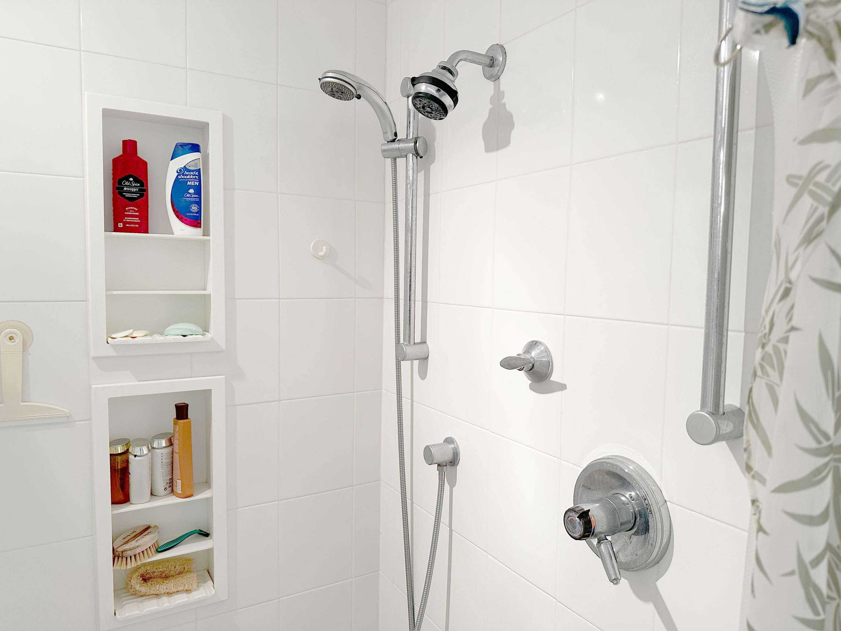 Living area with patterned sofa, white tile flooring, wood media console, and built-in corner shelving with decor.